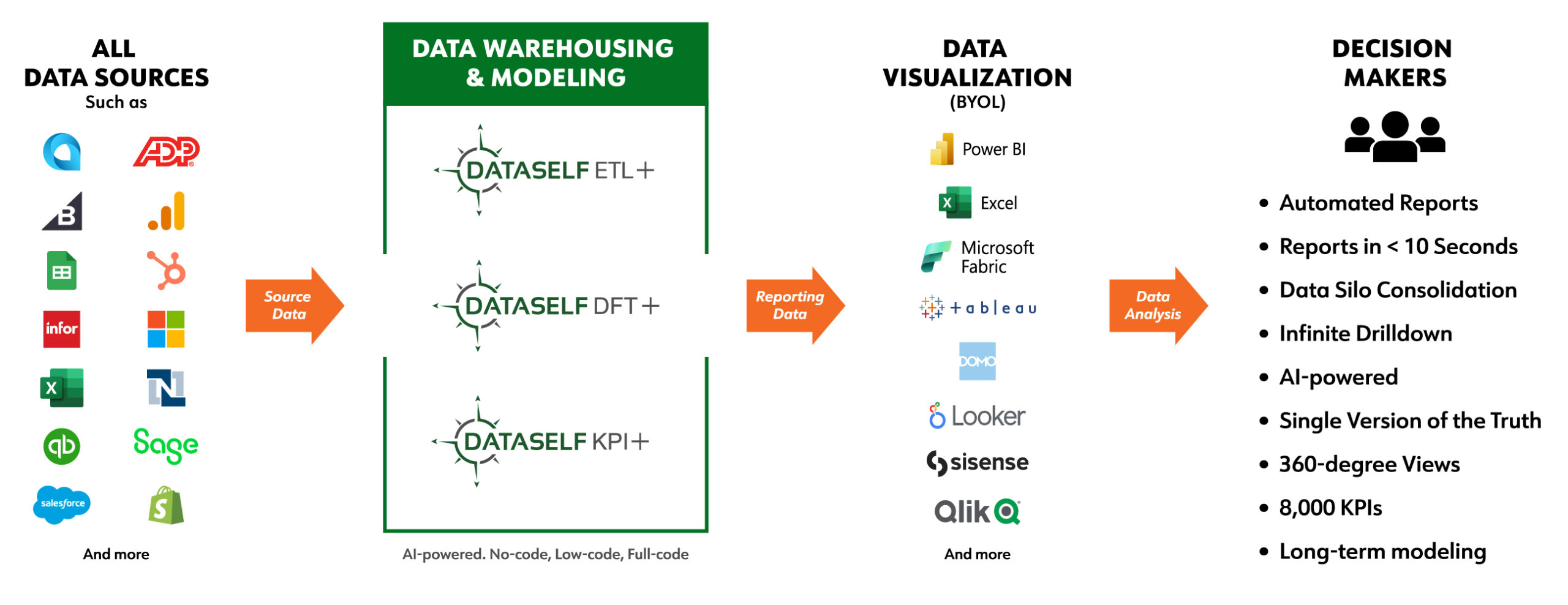 DataSelf’s next-generation BI solution is fully customizable and uniquely combines and integrates all of the components that are essential to forming a holistic business intelligence environment. This new approach to BI cuts implementation time from weeks and months down to hours and reduces costs by an average of 75%.