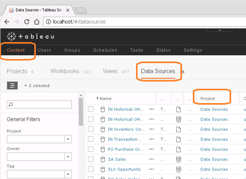 To locate the existing locations, on the Web Server, the Content menu > Data Sources tab, see the Project column.