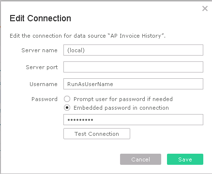 For extract data sources, since they are a self-contained copy of the data, the user permissions are controlled within the Web Server. On the other hand, live data sources will need new permission to access the underlying SQL source data every time a report is run. But you may not want to give every DataSelf user SQL reading rights. In this case, set the Authentication to "Impersonate via server run As account" when publishing the data source. Of course, the Run As account should already have full reading rights to the underlying data.